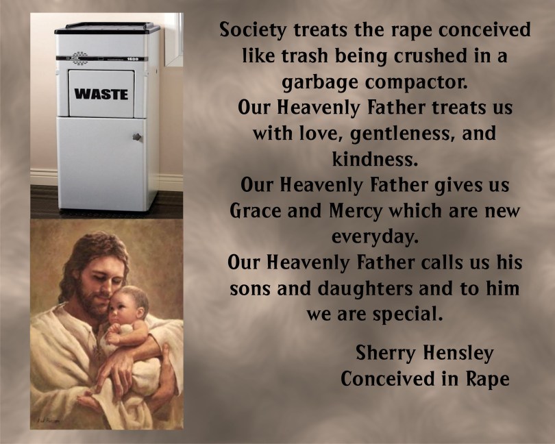 Talking with my husband late last night about the article, he told me put ten people in a row and let me guess which one was conceived in rape. I would not be able to tell, he said. He also told me that is discrimination.